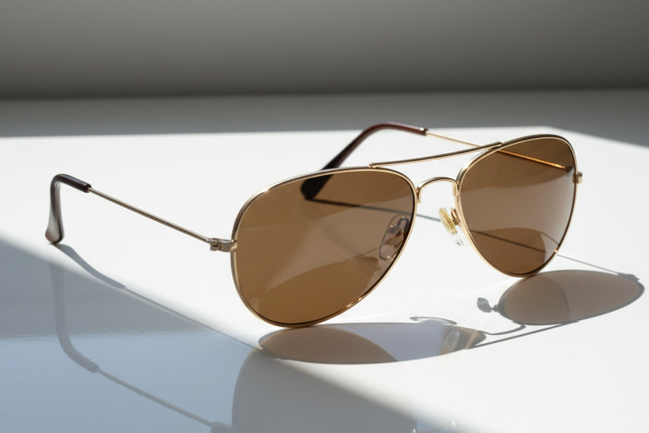 - Available in Gold with either a Brown or Grey Lens.