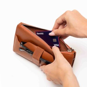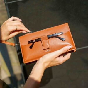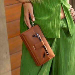 Compact yet thoughtfully organised, it fits your phone, cards, keys and daily essentials while maintaining a slim, lightweight silhouette. Wear it crossbody or as a wristlet, crafted in sustainable apple leather and presented in a premium gift box.